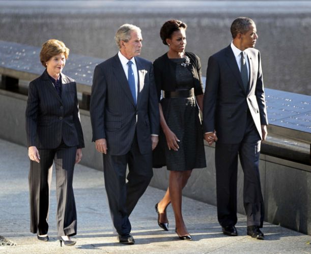 Джордж Буш и Барак Обама с женами пришли на место мемориала погибшим и поприветствовали пришедших. Они пожали друг другу руки над бронзовыми табличками с именами жертв 11 сентября. Западная интернт-аудитория не упустила случая обсудить это.