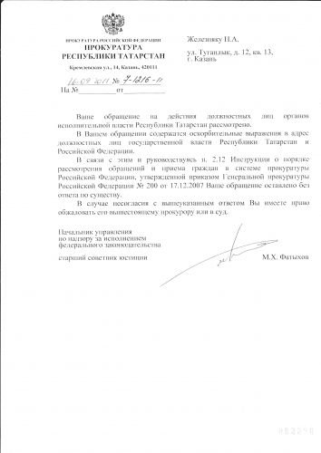 Внепроцессуальным актом (письмом №7-1216-11) от 16.09.11г., Начальник управления по надзору за исполнением федерального законодательства прокуратуры РТ ст. советник юстиции М. Х. Фатыхов, отказал в рассмотрении в якобы моей жалобы на незаконные действия должностных лиц органов исполнительной власти РТ, по тем основаниям, что в ней якобы содержатся оскорбления в адрес должностных лиц РТ и РФ.
