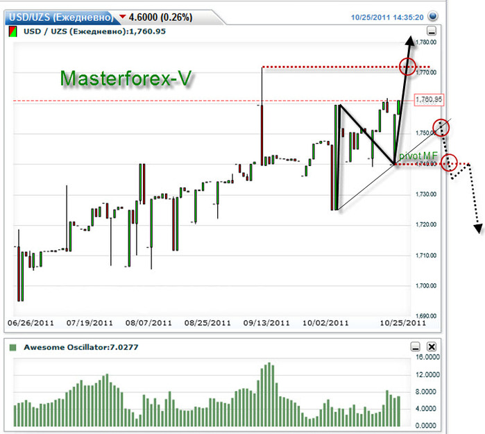 Курс узбекского сума, сформировав класическую фигуру тройное дно, продолжил восходящее движение - отмечают эксперты факультета детального изучения торговой системы Masterforex-V. Ближайшим уровнем сопротивления выступит исторический максимум 1771,8. Говорить о развороте тренда можно будет только лишь после пробития пивота МФ, наклонного канала МФ (см.график).