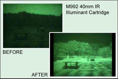 Американские военные имеют аналогичные 40 мм гранаты для освещения местности в видимом спектре: M583A1 белого цвета, M661 зеленого и M662 красного. Они прекрасно справляются со своими обязанностями, ярко освещая круг диаметром до 200 м в течение 40 секунд. Однако американские бойцы в Ираке и Афганистане имеют существенное преимущество перед повстанцами: приборы ночного видения, благодаря которым американцы воюют в темное время суток не намного хуже, чем днем. Естественно, что яркий свет сводит это преимущество на нет, лишая бравых морпехов возможности быть зрячими перед «слепыми» талибами. Армия США уже приняла на вооружение инфракрасные осветительные артиллерийские снаряды, например M1066 калибра 155 мм или 105-мм M1064. Производятся эти боеприпасы достаточно активно – где-то по 3-4 тыс. штук в год. По достоинству оценив «инфракрасную артиллерию», американские солдаты попросили разработать аналогичный боеприпас для их 40-мм гранатометов.