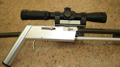 Внутри "приклада" размещается телескопическая удочка (видимо тоже из карбона), а на рукоятку устанавливается катушка для лески. Правда при этих "метаморфозах", ствол винтовки нужно снять.