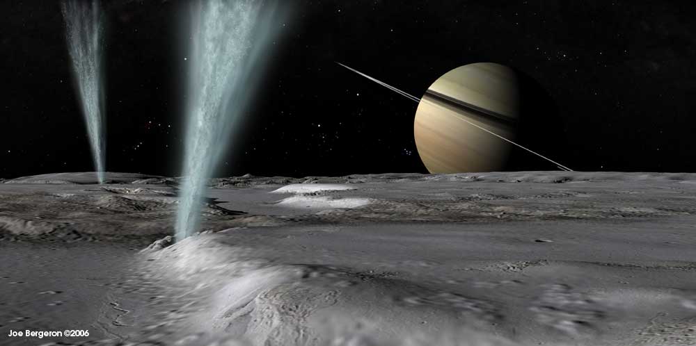 Космический корабль «Cassini» делает близкий проход внутренней луны Сатурна Энцелада, чтобы изучить перья от гейзеров, которые прорываются из гигантских трещин в южной полярной области луны. Copyright 2008 Karl Kofoed http://saturn.jpl.nasa.gov/photos/imagedetails/index.cfm?imageId=3244