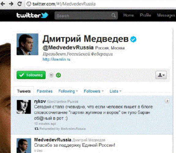 Глава государства разместил в своем микроблоге цитату пользователя @rykov: "Сегодня стало очевидно, что если человек пишет в блоге словосочетание "партия жуликов и воров" он тупо баран еб@ный в рот :)" (орфография оригинала сохранена).
