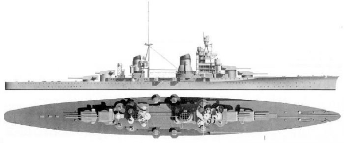 Закованный в 350‑миллиметровую броню, водоизмещением более 45000 тонн, корабль нес девять 15‑дюймовых орудий (381мм) длинной в 54 калибра и мог развивать скорость до 30 узлов. Прекрасные тяжелые крейсеры типа «Пола» по своим боевым и техническим характеристикам превосходили в марте 1941 года все зарубежные корабли своего класса, кроме японских.
