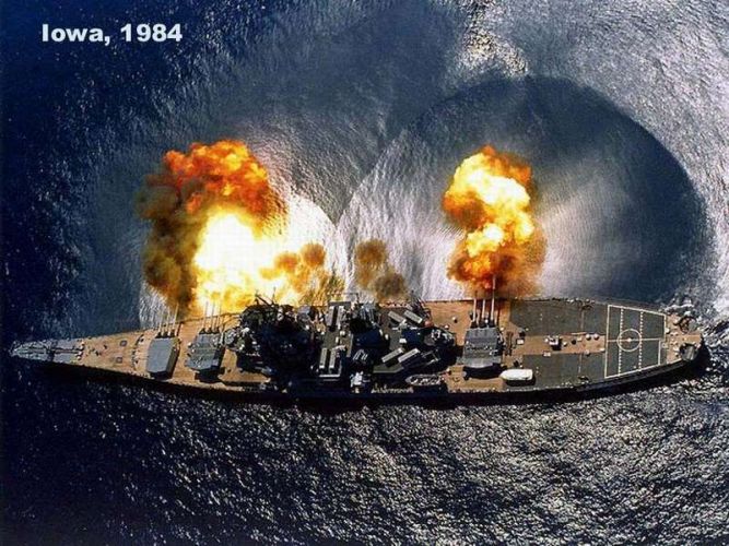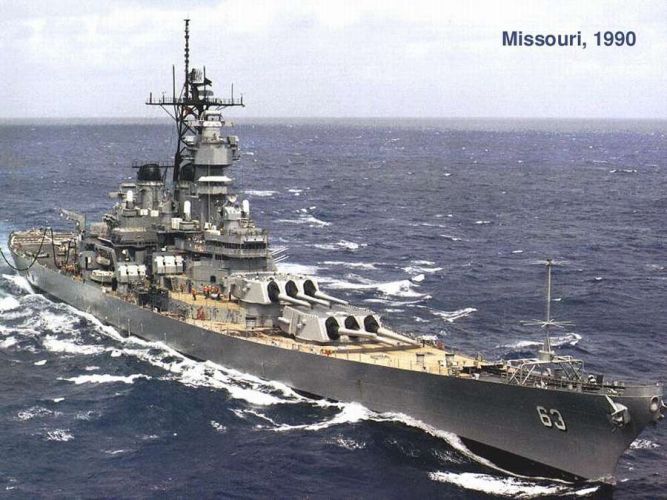 Миссури помним по фильму с Сигалом. Запомнились орудия. Каждый выстрел - более тонны взрывчатки или болванки на дальность до 25 км. Баллистикам надо давать звание героя совсоюза сразу.
