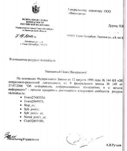 В дальнейшем пользователь под ником Pavel Durov (действительно принадлежит основателю «В контакте») сообщил, что «последние дни ФСБ просит нас блокировать оппозиционные группы, включая вашу. Мы принципиально этого не делаем». Позднее Дуров разместил в твиттере текст запроса УФСБ по Петербургу и Ленобласти с просьбой блокировать шесть сообществ, подписанный неизвестным заместителем начальника управления Александра Ручьева.