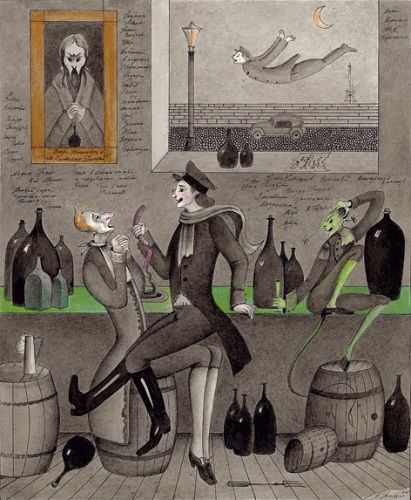 Михаил Шемякин в кожаных сапогах до колен делает уверенный шаг, его фуражка бросает тень на очередную гротескную иллюстрацию к песне Высоцкого "Французские бесы".