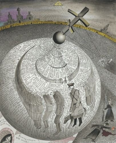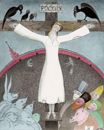 На моем рисунке купола позолочены именами расстрелянных и репрессированных. Эти люди кругами ада восходят к кресту.
