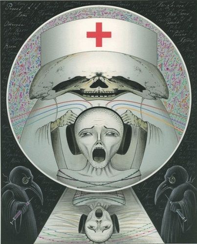 М.Ш.: Например, иллюстрация к песне "Конец охоты на волков". Эту песню Володя также посвятил мне. Волки здесь символизируют нашу нонконформистскую братию 60-х годов. Тут и Брежнев с ружьем, и затравленный волк-художник, и лагерная вышка. Частенько для перевоспитания богему отправляли в психушку. Там люди умирали гораздо дольше и мучительнее, чем если бы их просто расстреляли. Мне повезло, я пробыл там всего пару месяцев - вместо трех лет, которые мне дали. Увидев, что я действительно начинаю сходить с ума, меня вытащила оттуда мама. Вряд ли бы вы меня сейчас увидели, если бы я пробыл там весь положенный срок.