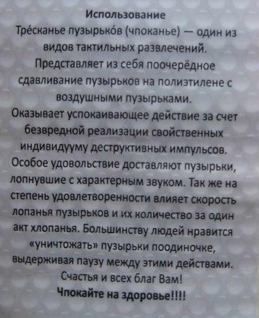 Это плёнка с пупырышками, которые многие любят лопать. К чпокеру прилагается ИНСТРУКЦИЯ. И вот такую фигню продают. Никто не в курсе, сколько эта мура стоит? Кому нравится чпокать, напишу программку, залью сюда. Чпокайте!!!