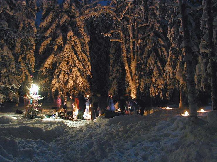 Собрались мы тесной дружеской компанией на квартире у нашего друга Николая встретить Новый год. А погода в этот вечер удалась изумительная: минус 5 градусов, полнейший штиль и мелкий пух снежинок, медленно падающих на землю. Вот тут-то и родилась у нас мысль: а не пойти ли нам всем в лесопарк на нашу любимую поляну? Там и елочка растет высотой в наш рост, и дровишки из сухостоя, запасливо заготовленные впрок еще летом, спрятаны в орешнике и прикрыты куском найденного брезента. Идея была принята единогласно – на ура! Оставили на дверях записку о том, где нас искать, если кто невзначай объявится, и, упаковав заранее принесенную еду и спиртное, гурьбой пошли пешком в лес, благо расстояние от дома до поляны было небольшое. Пришли, утоптали снег, разожгли костер, устлали картоном бревна вокруг костра, чтобы сидеть было удобнее, как могли принарядили елочку и приступили к проводам уходящего года.