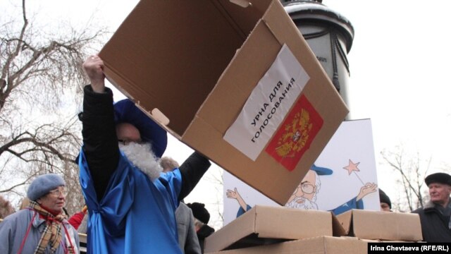 Рядом с Митрохиным появился человек в синем костюме и большой конусообразной шляпе – наряд, в котором часто изображают волшебников в сказках. По замыслу организаторов митинга, этот человек представлял образ главы Центризбиркома Владимира Чурова. На глазах у публики он продемонстрировал, как фальшивые бюллетени вбрасывались в урну 4 декабря и после подсчета голосов объявил победителем партию "Единая Россия".