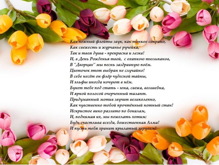 Алма! Хочу пожелать еще два раза по 112! А пока - вы молодая, цветущая и фонтанирующая искрами творчества, полыхающая светом ослепительных возможностей!