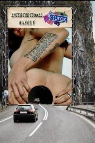 Надпись на рекламе презервативов гласит: Въезжайте в туннель безопасно!