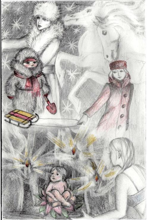 Календарь на стене становился тоньше с каждым днем, вечерами быстро темнело, и все говорило о том, что скоро придет зима. Девочка опасалась этого. Она ведь хорошо помнила, что в старой сказке Андерсена зимой случилось страшное. Ей представлялось, что как только выпадет снег, королева примчится на огромных ледяных санях, запряженных белогривыми конями, и навсегда унесет ее из родного города. Однажды, проснувшись ранним утром, малышка посмотрела в окно и ужаснулась: весь двор покрывал тонкий слой свежего снега. Мама достала из шкафа теплые вещи: маленькую серую шубку с капюшоном, забавные валенки с красной подошвой и вязаные варежки на резинке. У порога стояли девочкины санки, конечно, не такие красивые, как у королевы, но вполне симпатичные, к тому же, их застелили мягким одеялом. Дорога была длинная, но интересная. Все сегодня выглядело по-другому. Улицы стали светлыми, люди укутались в пальто и шапки. Мама тащила санки, которые, то легко скользили, то скребли по асфальту. Двор детского садика тоже припорошило снегом, на котором виднелись следы приходящих детей и родителей. В раздевалке с розовощеких малышей стягивали теплую одежду, и они отправлялись в группу.