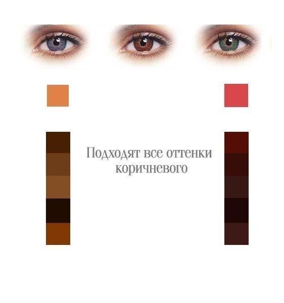 Так же и коричневый цвет теней идет абсолютно всем, только учитывайте, что если глаза голубого цвета, добавляйте немного оранжевого - т.е. коричневй будет как золотисто-коричневй, а для зеленых глаз - с добавлением красного.