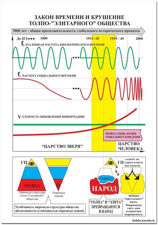 Мы живём в исторический период, когда изменение соотношения эталонных частот биологического и социального времени уже произошло, но ещё не завершилось становление новой — определяющей жизнь всего общества — логики социального поведения (алгоритмики самоуправления общества), в которой выразилось бы статистическое преобладание в обществе людей — носителей иной организации индивидуальной и коллективной психики. Но общественное управление на основе прежней логики социального поведения, обусловленной прежней статистикой распределения людей по типам строя психики, уже теряет устойчивость, т.е. власть, и порождает многие беды и угрозы жизни.