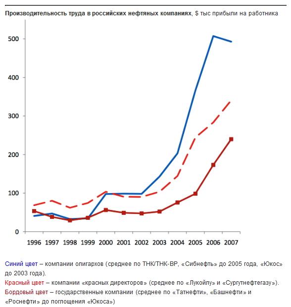 Также впечатляет график производительности труда на разных группах предприятий. Олигархи повысили ее в приобретенных организациях примерно в 10 раз за 10 лет, «красные директора» – примерно в 6 раз, а госпредприятия – лишь в 4 раза. Если забыть о справедливости распределения собственности, а говорить об эффективности, то стоило все компании отдать олигархам.