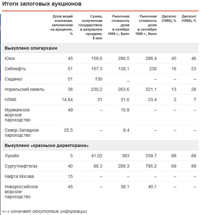 В 1995 году правительство заняло денег у бизнеса, оставив в залог акции крупнейших предприятий. Если к осени 1996-го государство не выплачивало занятые деньги, то акции переходили в собственность структуры, одолжившей правительству деньги. В итоге, одна часть крупнейших предприятий страны достались олигархам, то есть капиталистам новой формации. Другая часть предприятий сама выкупила собственные акции на собственные средства. Эту операцию осуществили возглавляющие их «красные директора», то есть менеджеры советской закалки.