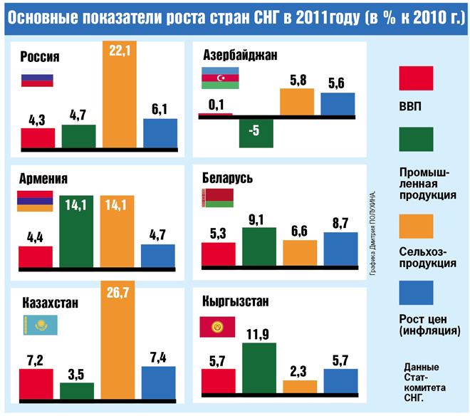 Статистический комитет СНГ обнародовал основные экономические показатели 2011 года. В рейтинге Россия из 11 союзных государств смотрится очень скромно: по показателям роста ВВП (+4,3%), промышленного производства (+4,7%) и инфляции (+6,1%) мы на последних строчках. Солидный количественный рост (+22%) виден только в сельском хозяйстве - это второй результат после Казахстана.