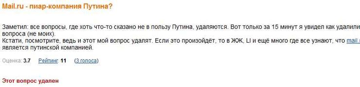 Кстати, посмотрите, ведь и этот мой вопрос удалят. Если это произойдёт, то в ЖЖ, LI и ещё много где все узнают, что mail.ru является путинской компанией.