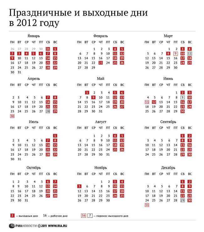 Так, в 2012 году выходные дни переносятся с воскресенья, 11 марта, на пятницу, 9 марта; с субботы, 28 апреля, на понедельник, 30 апреля; с субботы, 9 июня, на понедельник, 11 июня; с субботы, 29 декабря, на понедельник, 31 декабря.