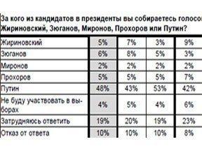 В рейтинге «анти-кандидат» первое место занял Владимир Жириновский, за него ни при каких условиях не проголосует 51% респондентов. Второе место – у Михаила Прохорова (30%), третье – у Геннадия Зюганова (28%), четвертое – у Сергея Миронова (19%). За Владимира Путина никогда не проголосуют 11% россиян.
