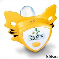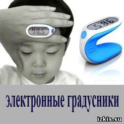 Электронные термометры нового поколения даже не имеют форму привычного градусника. Они могут быть сделаны в виде «пистолетика», с наконечником, который вставляется в ушко, в виде подковки, одевающейся на руку мамы, в форме соски и т.д. Инфракрасные термометры вообще позволяют измерять температуру бесконтактно. Результат измерения температуры инфракрасными и электронными термометрами мама получает не через 7 минут, как с ртутным градусником, а в несколько раз быстрее. Некоторые термометры позволяют измерить температуру за 3 секунды!
